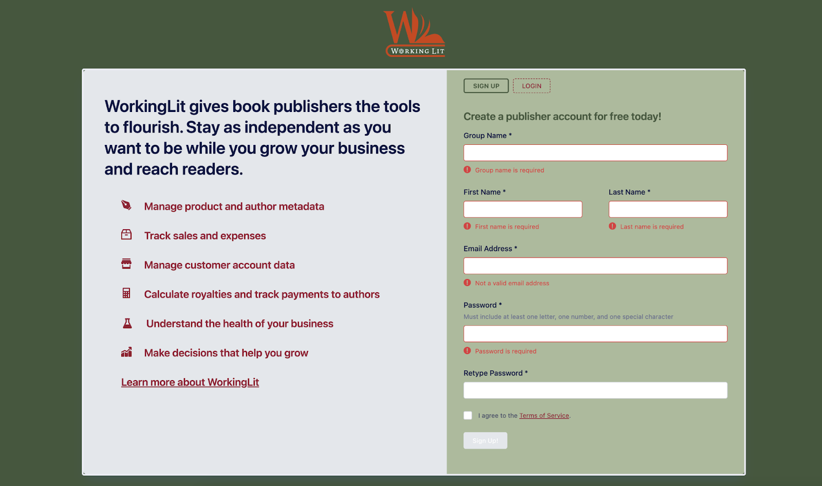 Navigate to WorkingLit.com and create an account for free by clicking “Login/Register” in the top right corner. You’ll be directed to an Account Creation screen.
