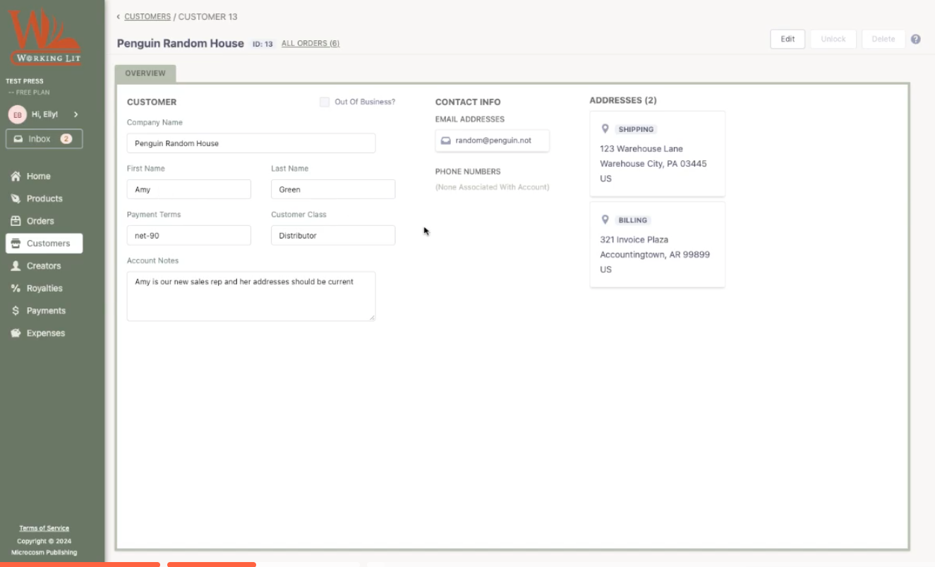 You can also add in multiple addresses, shipping and billing. WorkingLit offers customizable customer classes (store, third-party vendor, distributor, etc.), which you can keep track of in Reporting (which we’ll get to later).