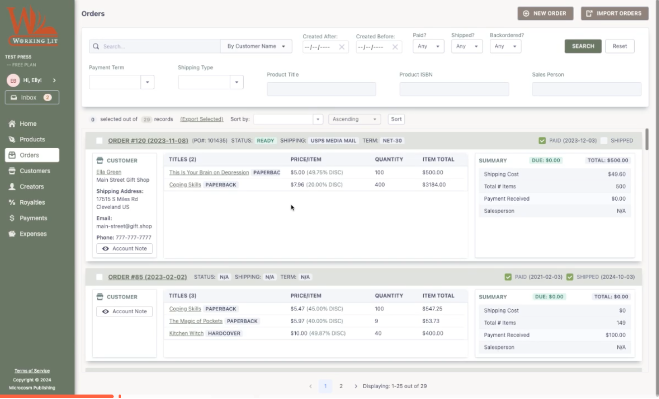 Whether you add orders in bulk or one at a time, you have plenty of options for gathering data. When adding a new order, you can customize a variety of fields with drop-downs for existing items like Product and Customer. WorkingLit can note discounts, salesperson, payment terms, and more.