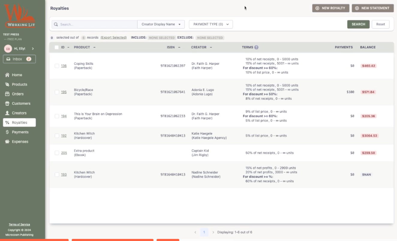 Click on NEW ROYALTY to add terms for a new product/creator.