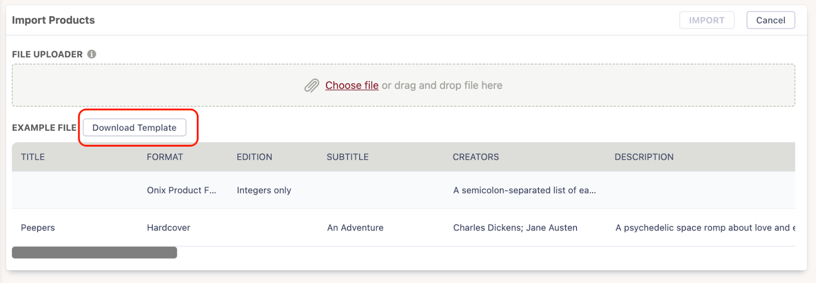 Have a large catalog? Click IMPORT PRODUCTS. Download the template, add your own data, and re-upload.