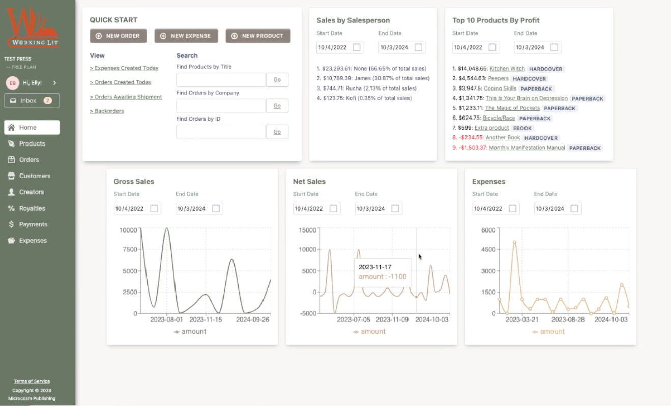 As soon as you log in, you’ll see your dashboard.Once you have it populated with titles, sales, and expenses, it’ll show you a ton of data about the health of your business.