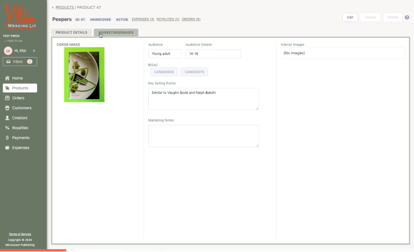 You’ll notice a second tab where you can add marketing images (cover image, interior images, etc) and additional marketing materials like BISAC codes and key selling points.