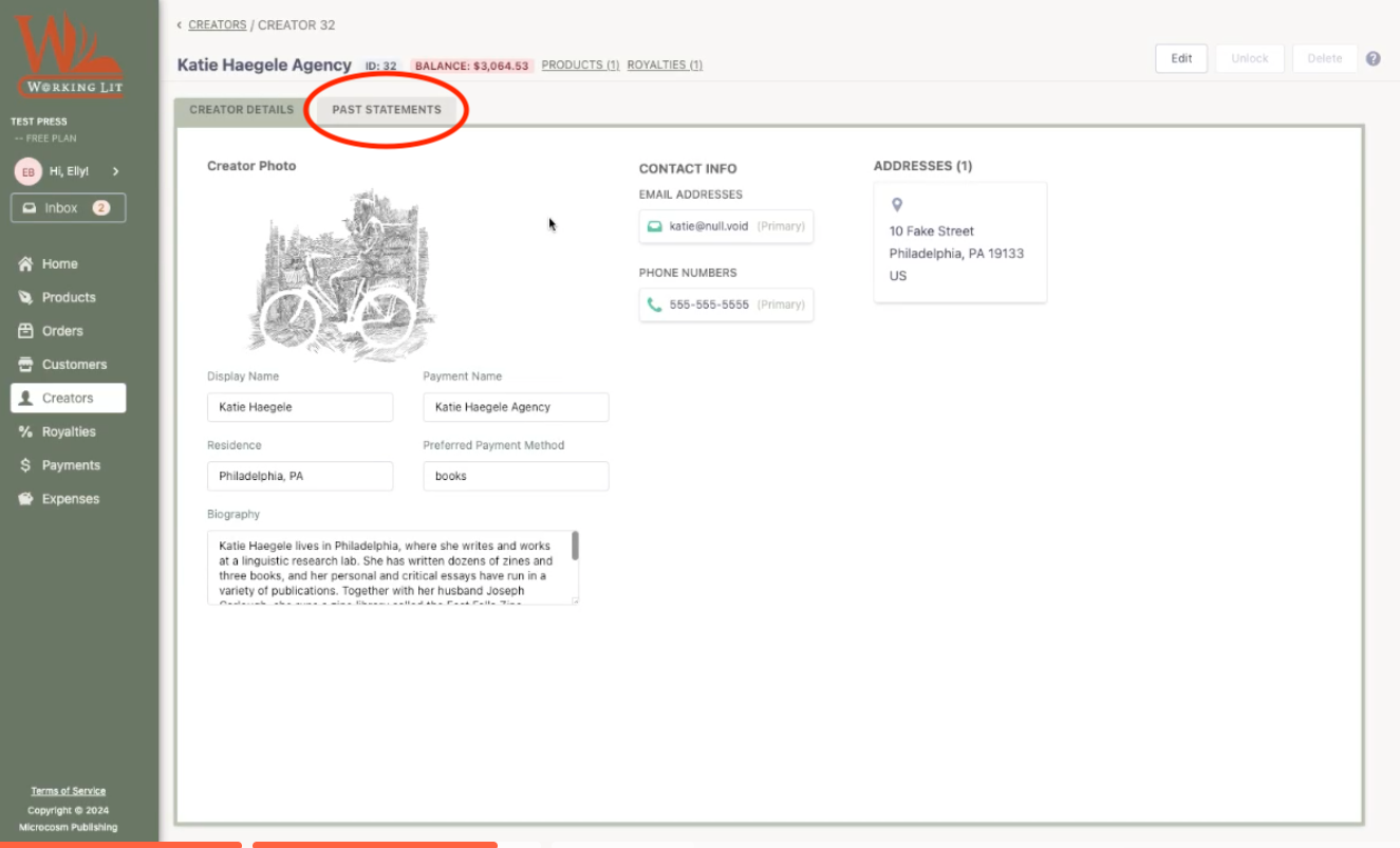Click on the second tab, “Past Statements,” to access any past royalty statements associated with that creator.