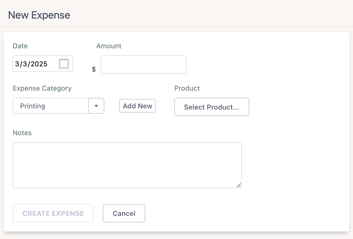 Select an associated product, if one applies. Select (or add new) Expense Category. We recommend using Expense Categories that your accountant recommends so tax season is streamlined!