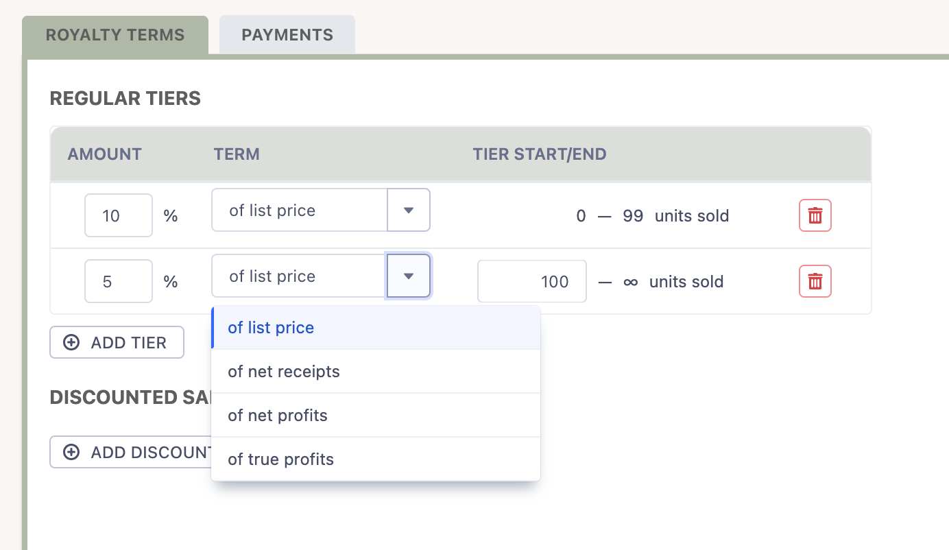 WorkingLit makes it easy to offer tiered royalties for a variety of terms.