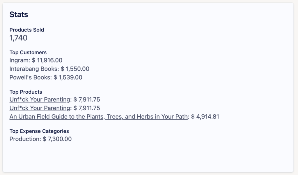 - Along the top bar next to the product title, you can see and link to any expenses, royalties, and orders associated with this product.